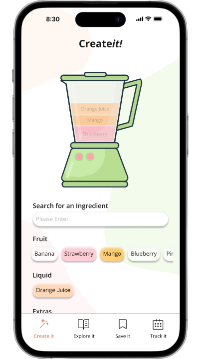 We designed a mobile application to help users create smoothie recipes based on their desired ingredients in order to reduce food waste and to keep track of their nutrients.