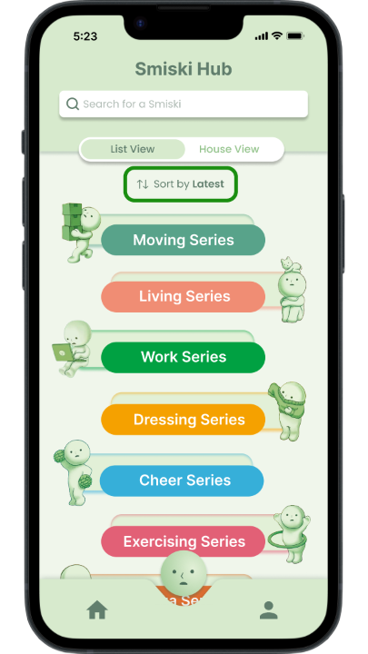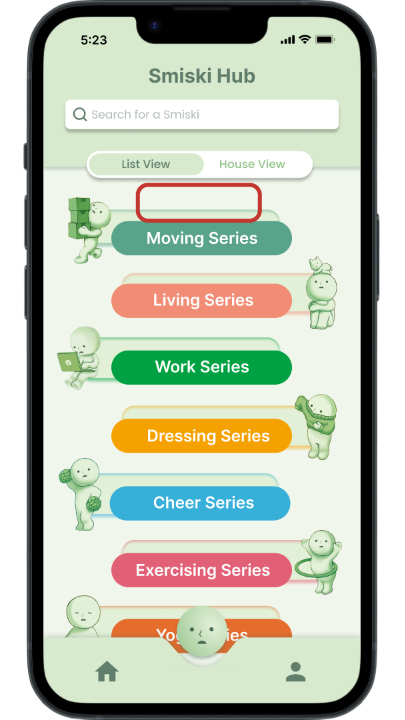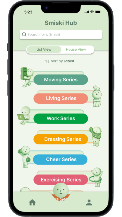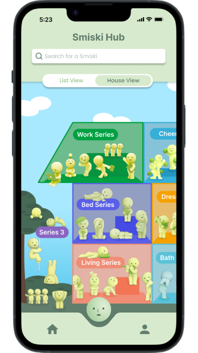 The user will be able to read information about each Smiski. Users can select a specific Smiski through the list view or through our novel interaction, the house view.